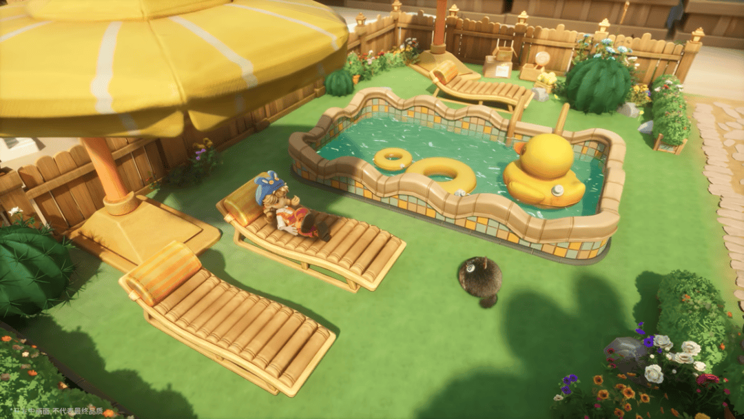 在游戏里,这种创造的乐趣被“小”视角再次放大。你可以自由地装饰自己的房间,身边一切寻常物品都焕发出新的用途,纽扣成为了板凳,耳机化身成了音箱。除了自己的小房子可以装饰,玩家还可以对室外的一些区域进行改造,比如放置栅栏、铺上地砖、种上花草,就像打理自家小院一样,又或者安置泳池、遮阳伞,晒上美美的日光浴。