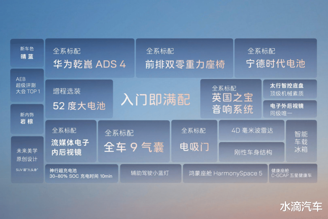 从800V高压快充,到激光雷达,从按摩座椅,到AR-HUD,以往在高端车型上才能见到的配置,如今纷纷下探到这个价位区间。虽然上述这些一般在高配车型上才有,但很多直接提升用车体验的功能配置,已经在该细分市场做到了“全系标配”。