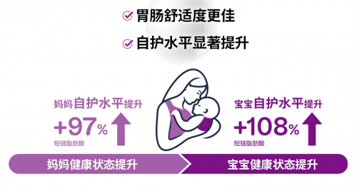 在妈妈获得这份“升级版”状态后,还能同步传递给宝宝,这也是这项研究非常让人心动的地方。研究结果表明,妈妈自身获得的健康益处可通过乳汁传导给宝宝,让宝宝同样实现“升级版”的成长。宝宝的胃肠舒适度更佳,自护水平大幅提升,其中短链脂肪酸提升108%,谷胱甘肽水平也显著增加,炎症水平降低。换句话说,宝宝好消化,肚肚不闹别扭,自然就更少哭闹,妈妈也少操心,养娃之路顺畅一大截!妈妈和宝宝共同受益,这条科学验证的传导路径,也是官媒们频频强调的亮点之一。
