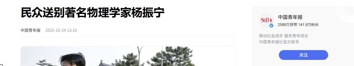 10月24日,杨振宁老先生的追悼会在北京如期举行。