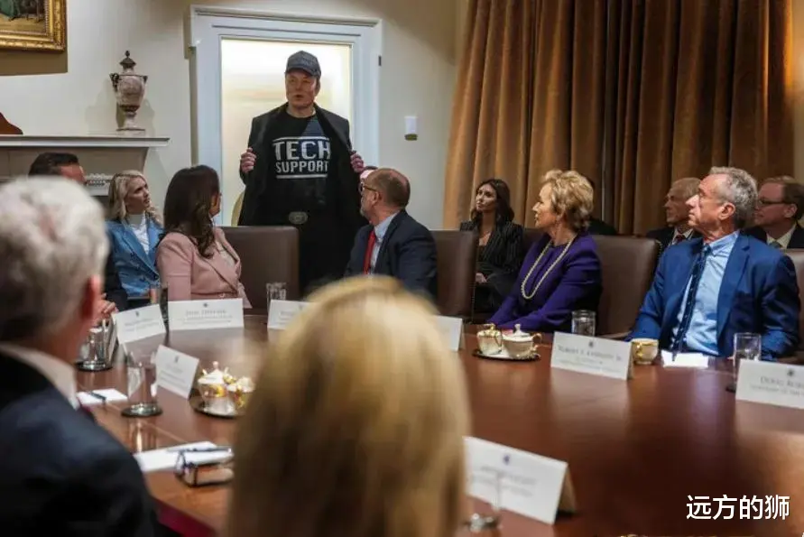 马斯克身穿印有“技术支持”字样的黑色T恤坐在内阁成员身后,马斯克是在表明自己不会参与权力之争,只是提供“技术支持”。