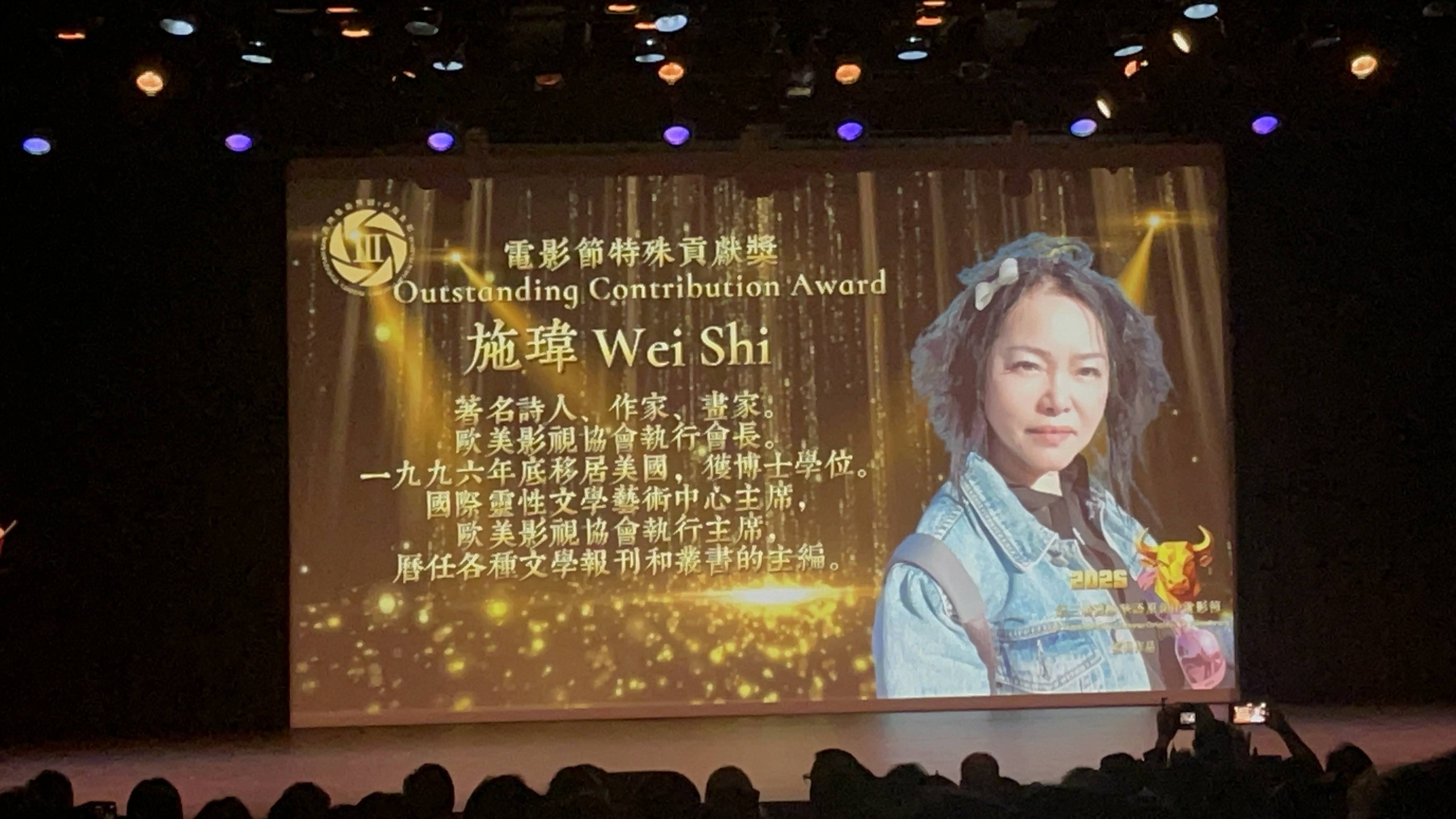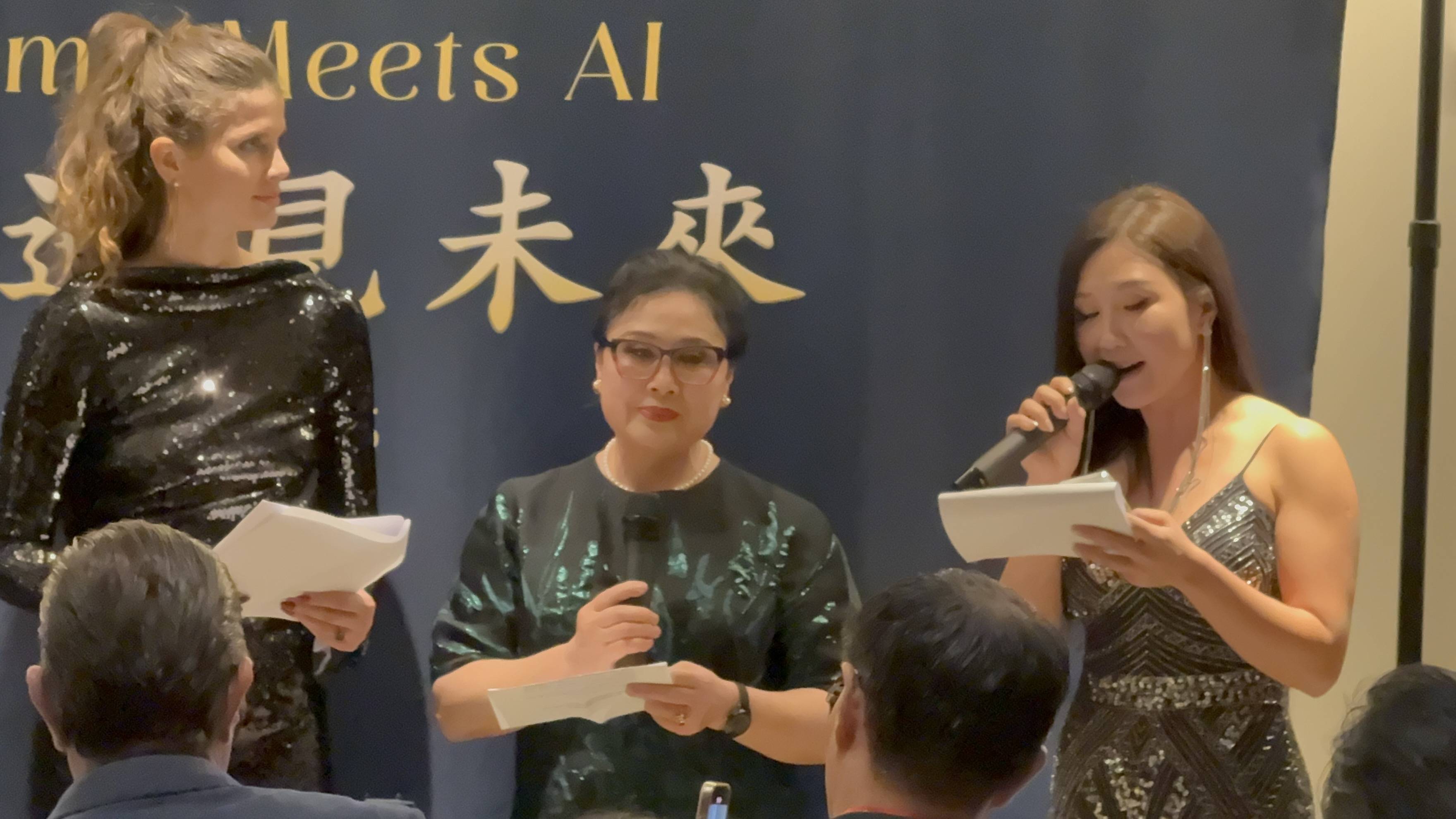 典礼伊始,电影节开幕酒会的余温犹存。早在10月17日晚的曼哈顿开幕酒会上,电影节顾问团主席艾伦·赵琼女士便以热情洋溢的演说拉开序幕。她在致词中回顾了电影节从三年前温哥华、波士顿起步,到如今落户纽约的蜕变历程,强调“艺术没有国界,创意没有边界”。赵琼女士特别指出,AI浪潮正改变世界,而电影人正以热情与智慧,让科技拥有情感,让机器学会温度。她代表组委会感谢所有支持者,包括赞助机构世界和平友好交流协会,为电影节空运400多盒中国第一禅茶“惠明茶”作为特别礼品;以及科学家顾问周春松院士资助的金牛奖杯制作。赵琼女士呼吁:“让我们为创意干杯,为艺术干杯,为未来干杯!”这番话语不仅点燃现场气氛,更为后续颁奖典礼注入灵感火花。