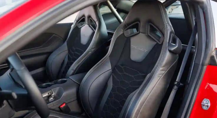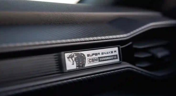 目光转向内饰,Shelby Snake-R延续了家族化的设计风格,前排最大的变化是换上了印有Shelby标识的桶型运动座椅,表面采用Alcantara+皮革拼接包裹,缝线虽然粗犷,但质感符合一台性能级跑车应有的味道。另外,在座舱内我们可以看到六挡手动挡换挡杆,朴素的圆球设计放在这里丝毫不显突兀,纵使低调平凡,但视线聚焦在副驾驶前方的专属“Super Snake”铭牌时就会明白,这一切都不简单。