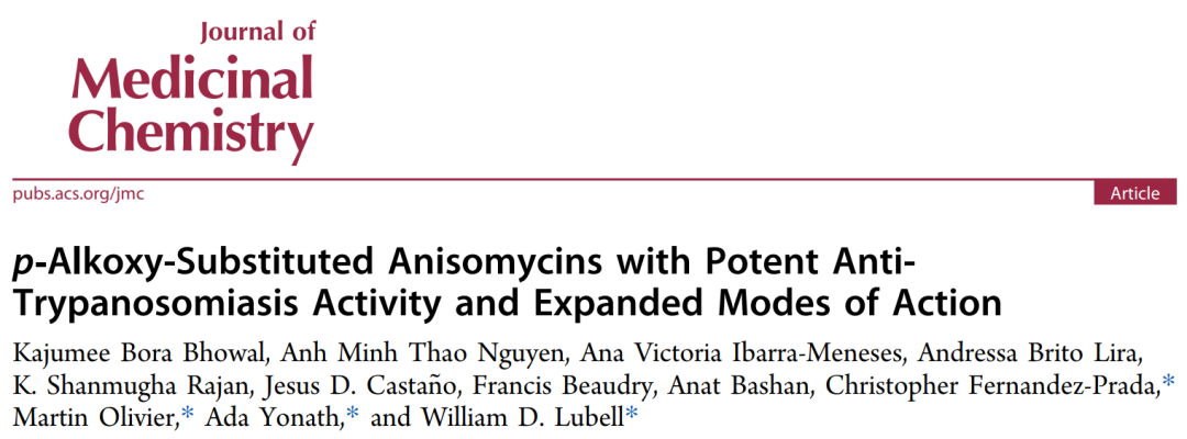 该研究以“p‐Alkoxy-Substituted Anisomycins with Potent Anti-Trypanosomiasis Activity and Expanded Modes of Action”为题发表在《Journal of Medicinal Chemistry》上。