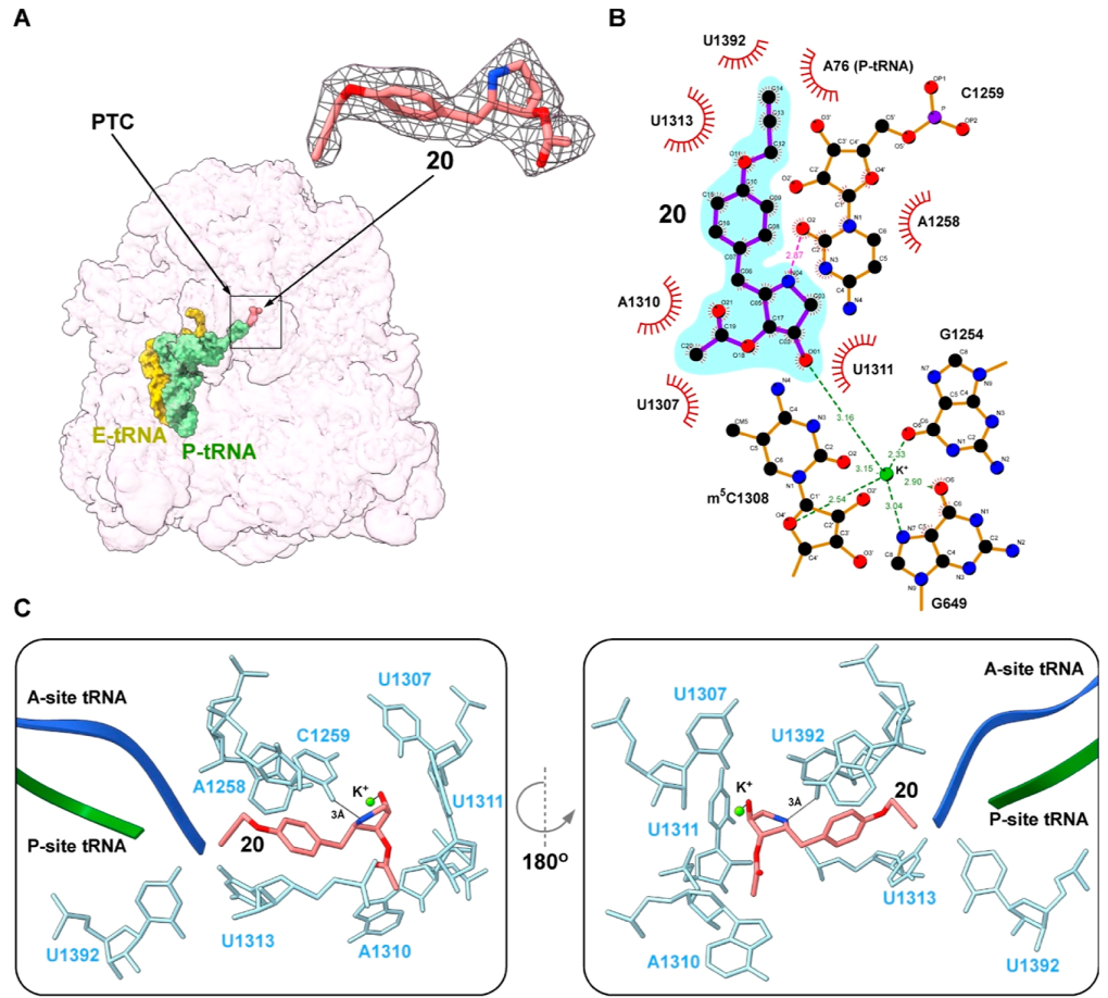 图3. 化合物 20 与利什曼原虫核糖体的结合模式