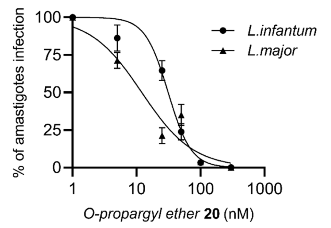 图2. 化合物20对感染了利什曼原虫野生型和利什曼原虫主要型的骨髓来源巨噬细胞的影响