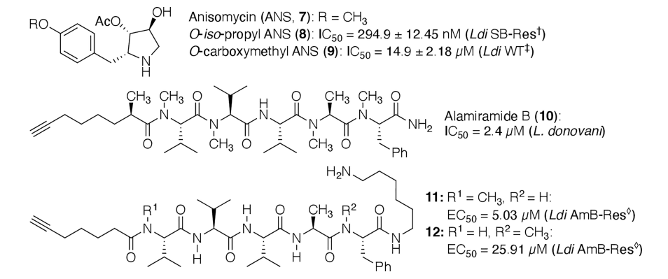 图1. Anisomycin (7), almiramide (10), 和 8, 9, 11, 12.