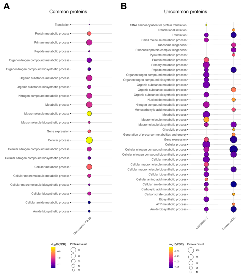 图4. 通过TPP,鉴定了7和20 在婴儿利什曼原虫前鞭毛体中全蛋白质组范围内的作用靶点