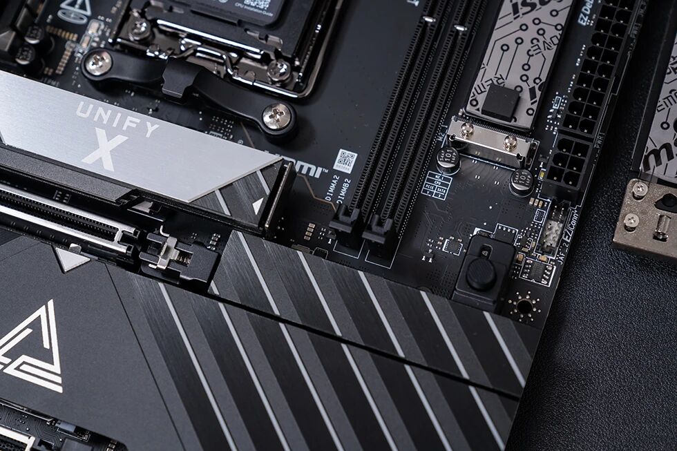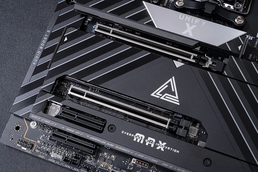 微星 MEG X870E UNIFY-X MAX 暗影主板在外观上延续了新一代UNIFY系列的哑黑和亮银撞色设计。主体区域大面积覆盖铝制散热装甲,其中VRM散热装甲、主M.2插槽及内存附近的M.2插槽对应位置的散热装甲表面,均采用亮银色铝合金镜面装饰,整体构成"V"字形结构布局。其余黑色散热装甲表面均采用"X"走向的斜纹暗槽工艺设计。特别值得注意的是,主M.2散热装甲上镌刻的"UNIFY X"和"MAX”标识,既形成显著的视觉焦点,又通过独特的造型设计与标识布局,有效提升了产品整体的辨识度与视觉冲击力。