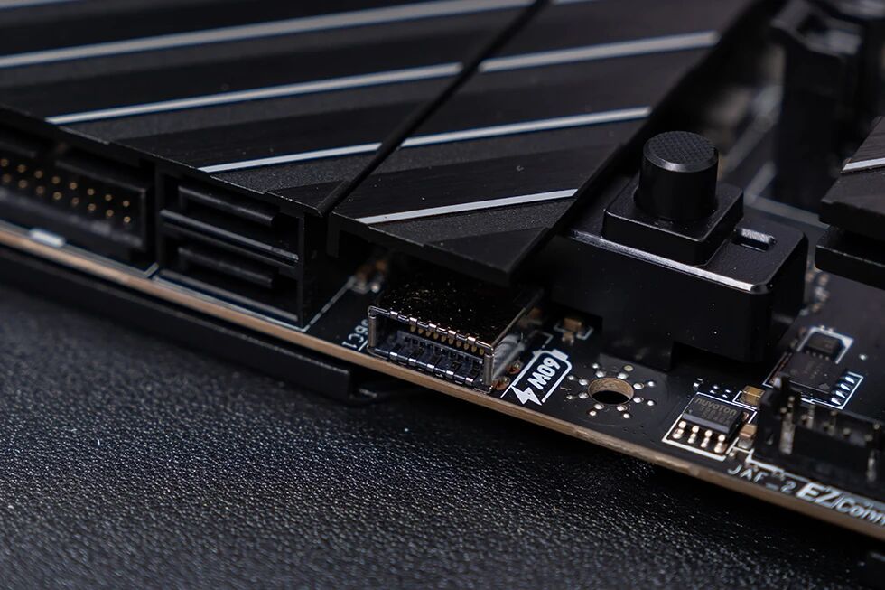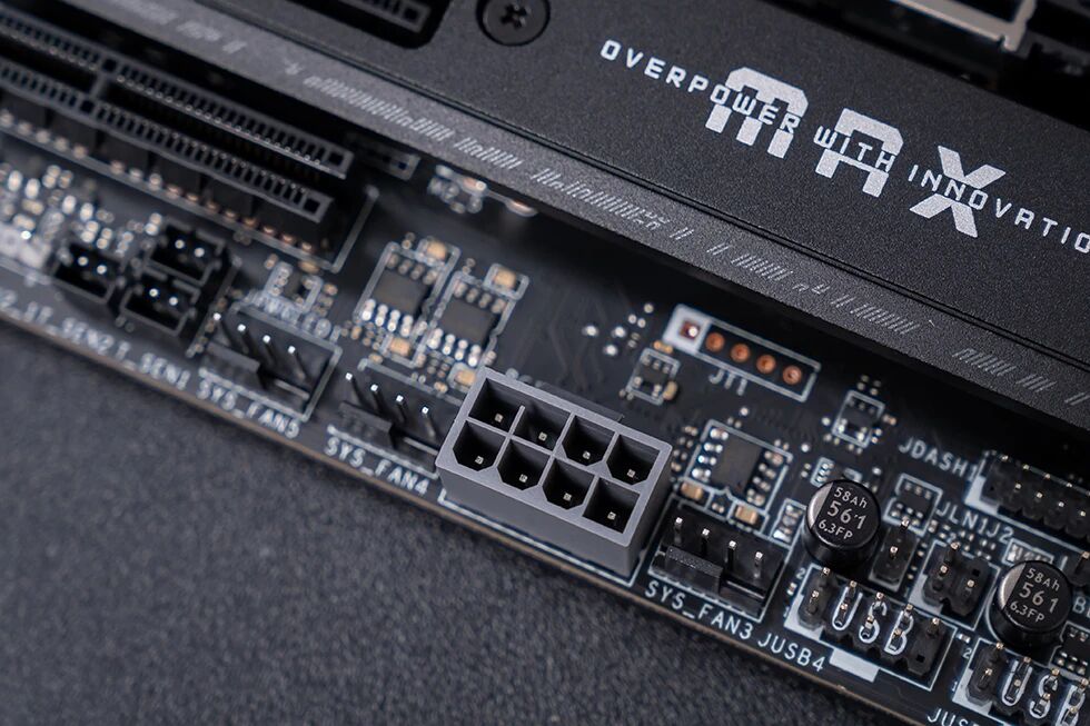 此外,主板还支持 ATX 3.1 标准,独家的 Supplemental 8-pin PCIe 供电接口能为高功耗显卡提供额外的 12V 供电,最大可支持 2.5 倍功率波动,即使是双旗舰显卡交火或 AI 计算的高负载场景,也能保证供电稳定,为未来新一代显卡预留了充足的供电冗余。