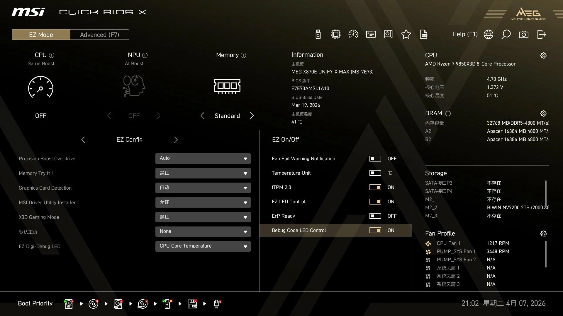 主板搭载了全新升级的 Click BIOS X,不仅将界面清晰度升级至 1080p,视觉体验更舒适,还对界面进行了精简优化,常用选项集中展示,新手也能快速上手。BIOS 整合了一键超频功能,同时新增了大量常用选项设置,支持独立的外频调节(BCLK),专业玩家可进行更精细的超频调教,64MB 大容量 BIOS 则保证了界面的完整性和功能的丰富性,即使未来升级新 CPU,也能通过 BIOS 更新实现完美兼容。