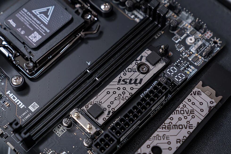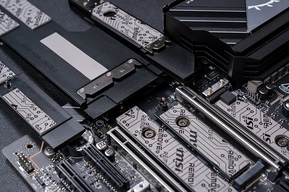 微星在这款主板上融入了大量创新的 DIY 设计,既降低了硬件拆装和超频的门槛,也让高端玩家的操作更便捷,兼顾了新手和资深玩家的需求。显卡快拆设计是一大亮点,轻轻一按即可锁止或解锁 PCIe 插槽卡扣,告别了传统的卡扣抠取方式,拆装显卡时无需借助工具,也避免了卡扣损坏的问题,尤其适合需要频繁更换显卡的玩家。