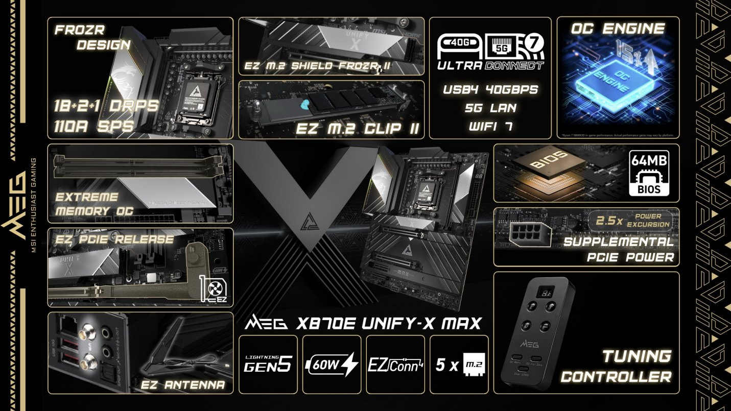 微星 MEG X870E UNIFY-X MAX 暗影 主板的核心定位十分明确 ——AM5 平台的高性能旗舰,其采用专属的 2 DIMM 双通道架构(1SPC 单插槽每通道设计),从硬件底层为 DDR5 内存超频做了极致优化。同时主板全面支持 AMD 锐龙 7000/8000/9000 系列台式机处理器,完美适配最新的锐龙 9000系列处理器,做到了硬件生态的无缝衔接。“MAX” 后缀也赋予了这款主板特殊的意义,升级后的 OC Engine 超频引擎和 64MB 大容量 BIOS ROM,不仅让当下的性能释放更彻底,也为未来新一代 AM5 CPU 的升级预留了充足空间,真正实现 “一次装机,多年不落伍”。