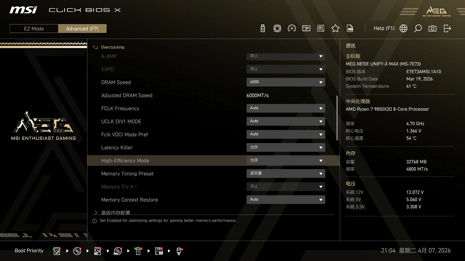 微星性能切换设置 融合了 AMD PBO 和微星手动超频的优势,用户可根据散热器性能灵活选择,也支持手动精细调节,兼顾单核心和多核心应用的效能需求。而PBO BCLK BOOSTER 一键超频功能,能根据 CPU 体质预设 2 种超频选项,搭配 High-Efficiency Mode 后,CPU 效能最高可提升15%,且能保证 GPU、内存、PCIe 和 NVMe 的稳定性,让超频不再是专业玩家的专属。