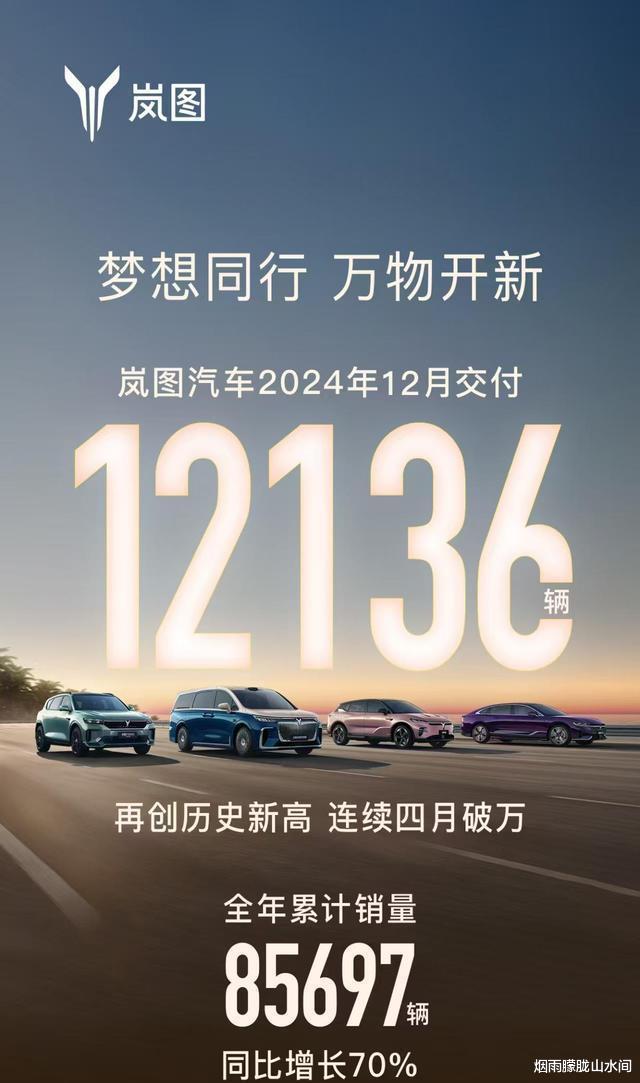 2025年初,各大汽车企业纷纷公布2024年的销售业绩。对岚图汽车来讲,刚刚过去的2024年可是其迈向高质量发展的起始之年。在12月份的时候,岚图汽车的交付量多达12136辆,这一数据再度刷新了历史记录,并且它已经连续四个月成功迈进“万辆俱乐部”。至此,岚图汽车在2024年全年的累计销量达到了85697辆,相较于上一年,其销量同比增长了70%。