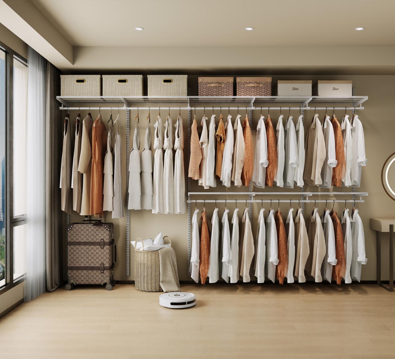 六、真正个性化的定制,而非标准产品的堆砌区别于传统衣柜“选尺寸、选颜色”的浅层定制,金属衣帽间系统支持更深度的个性化。从使用者身高、衣物类型(长衣/短衣/配饰/鞋包等)、拿取习惯,到空间动线、光照条件等,都可纳入设计考量。