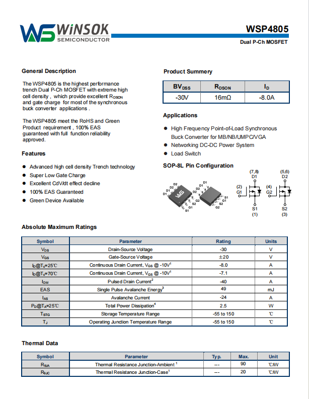 阅读灯从单一ON/OFF转向256级柔光调色,需在-12 V母线、1 A负载下实现无频闪调光,对功率器件提出“-30 V耐压、16 mΩ低阻、SOP-8L小封装”三维硬指标。微硕WINSOK WSP4805(-30 V/-8 A/16 mΩ,SOP-8L)凭借双P集成、12 nC超低栅极电荷与49 mJ雪崩能量,成为阅读灯“高边柔调核”首选。