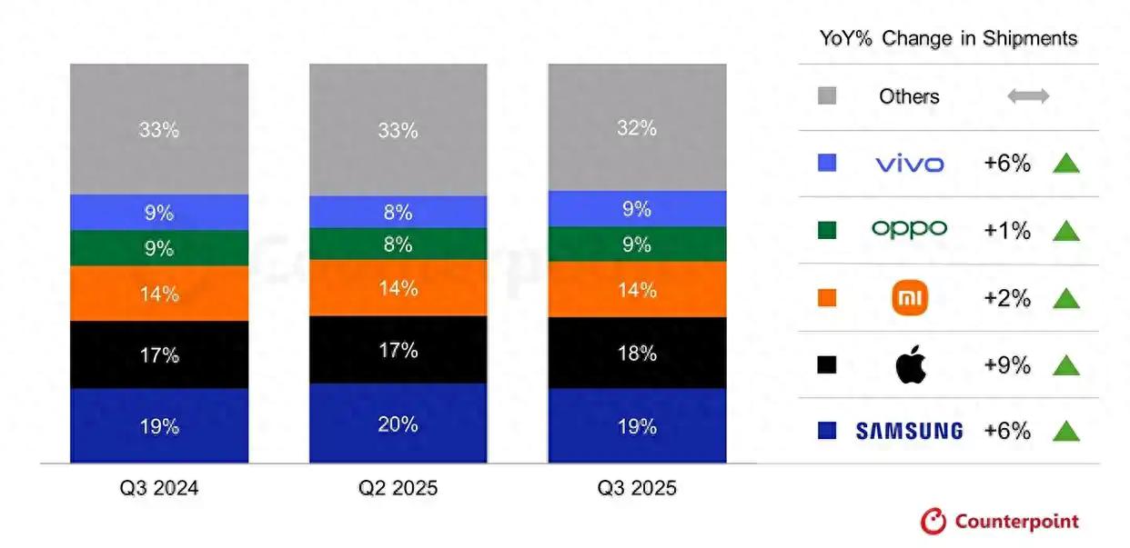 (CounterPoint Research 公布的2025年Q3全球智能手机品牌出货量排名)