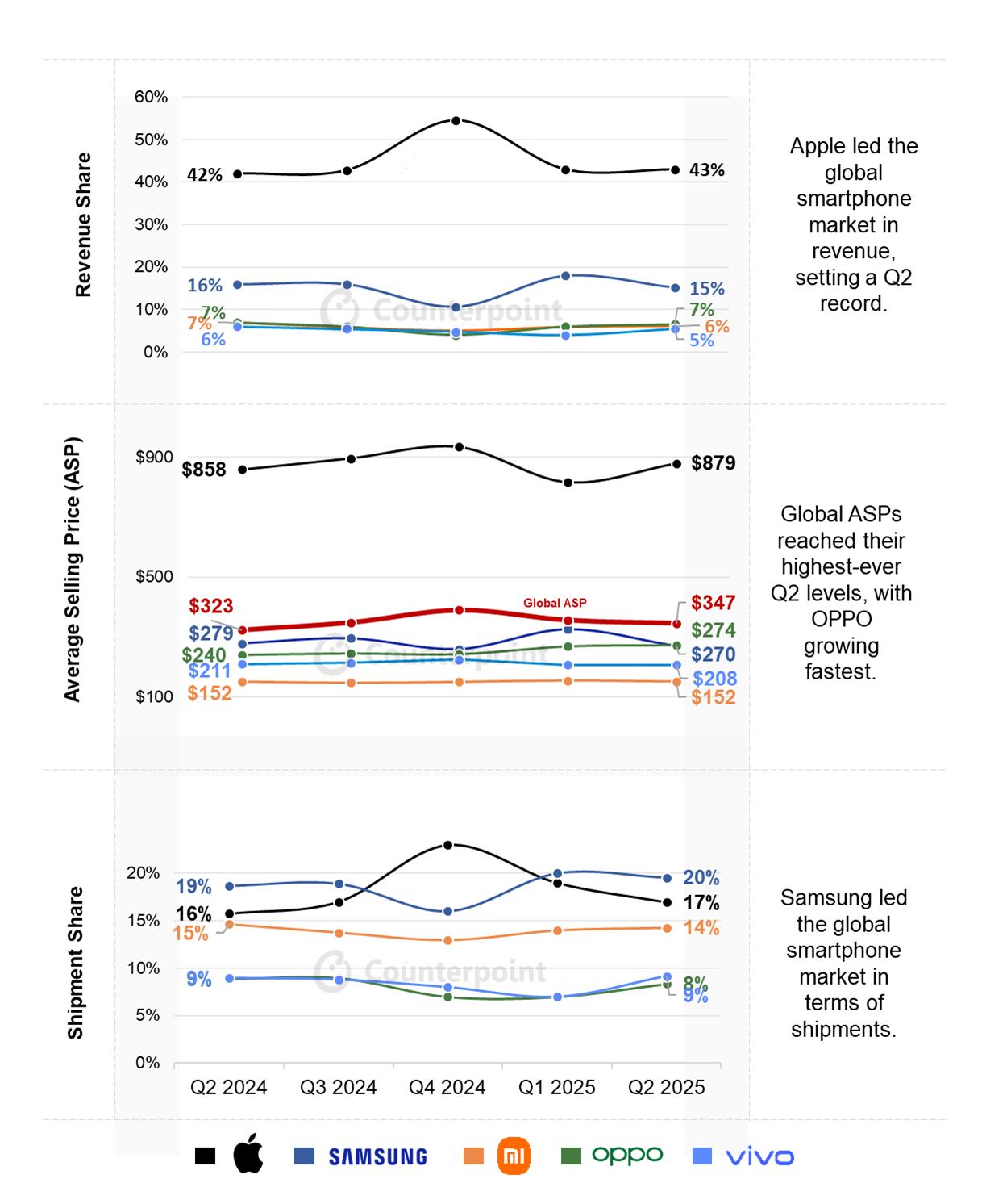 在这场价值重构中,OPPO 的表现暗藏玄机:Counterpoint Research 数据显示,2025 年 Q2 其平均售价(ASP)已达 274 美元,不仅仅次于苹果位居 TOP 5 品牌第二,更以 14% 的同比增幅成为头部品牌中增速最快的玩家。