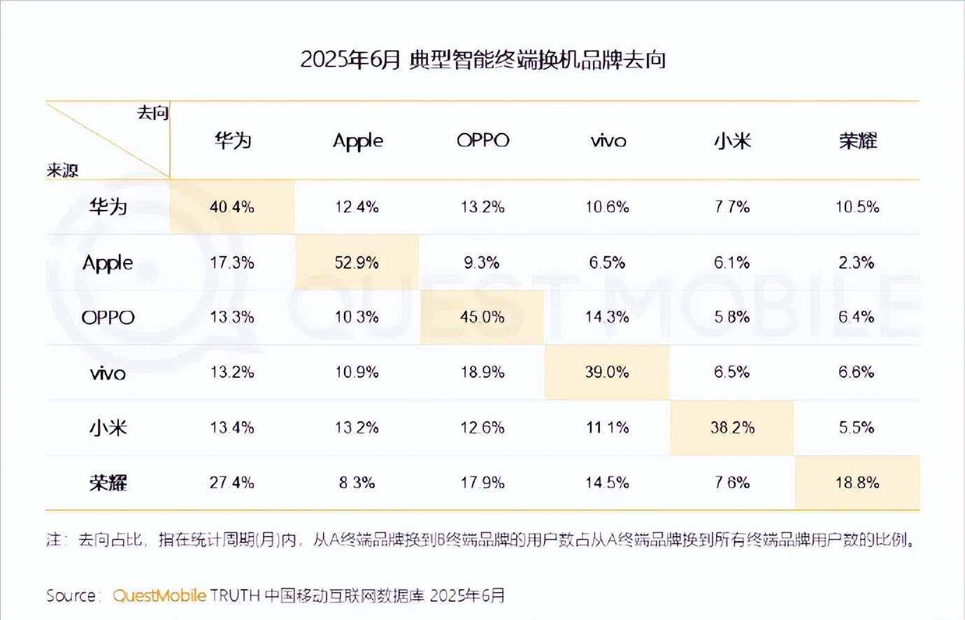 (QuestMobile公布的2025年6月份智能手机终端换机品牌去向)