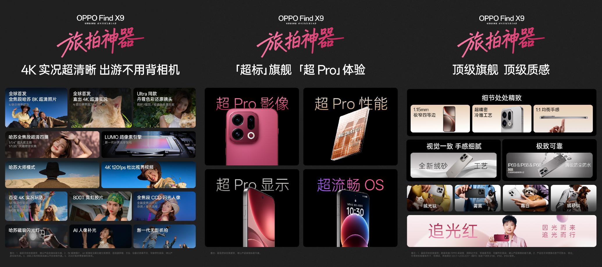 产品端OPPO更是直击用户核心痛点,10月16日正式发布的 Find X9 系列堪称典型:针对用户 “旅拍既要风景全景又要细节” 的需求,首创主摄与潜望长焦双 2 亿像素架构,10 倍变焦下可清晰捕捉舞台歌手的面部细节,配合哈苏调校的丹霞色彩技术,让复杂光线下的成像既保留天空层次又还原暗部细节;