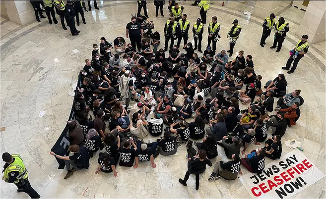 示威者涌入国会大厦当地时间10月18日,数以百计的示威者涌入了美国国会大厦,呼吁美国政府支持巴以冲突的停火。示威者手持高举标语牌,上面写着「让加沙生存」等口号,声嘶力竭地高喊「立即停火」。这一热烈的呼声彰显了他们对中东和平的强烈愿望。