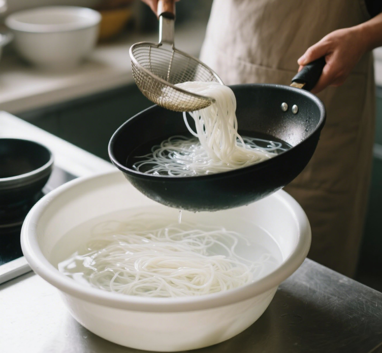 在沸水中翻滚的粉条,如同灵动的舞者,在高温的舞台上尽情展现着自己的魅力。随着时间的推移,粉条逐渐变得透明而有韧性,散发出诱人的光泽。当熟化时间一到,师傅们迅速将粉条捞出,放入冷水中冷却。这一步看似简单,实则是防止粉条粘连的关键。冷水如同温柔的怀抱,让粉条迅速降温,表面的淀粉不再继续糊化,从而避免了粉条之间的相互粘连。经过冷却的粉条,变得更加爽滑、劲道,为后续的烹饪做好了充分的准备。