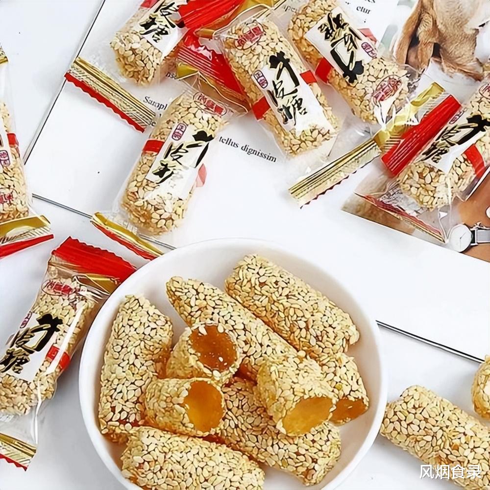 这糖讲究“叠48层”的手艺,糯粉、芝麻、麦芽、白糖缠成金黄酥条,