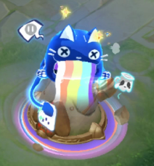此外,小乔的推塔特效和击败特效也十分搞笑,推塔后会留下一个吐彩虹的电视猫猫,击败后会出现一个鲱鱼南瓜派。击飞时的粒子光效也较为明显。