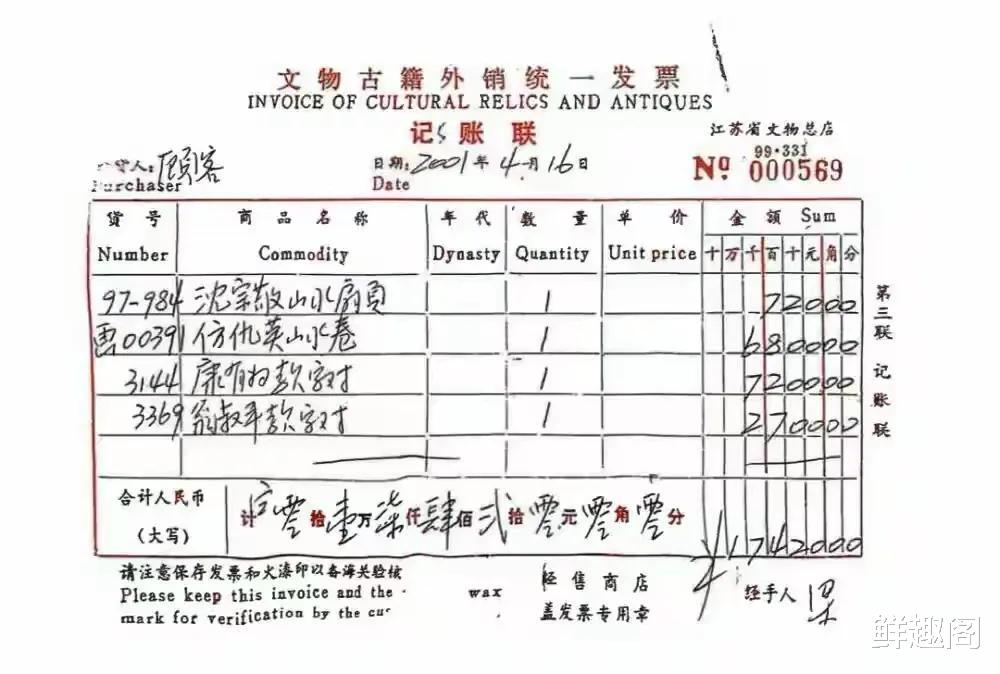 院方提供的一张销售清单上,买方一栏只登记了含义模糊的“顾客”二字。这个截图此前也在网上流传。归根结底,这幅画确实是从南博“消失”的,并于2025年出现在了拍卖市场。这三条时间线无法同时成立,如果记录和证人证言属实,那么南博2001年的销售发票又怎么解释呢?