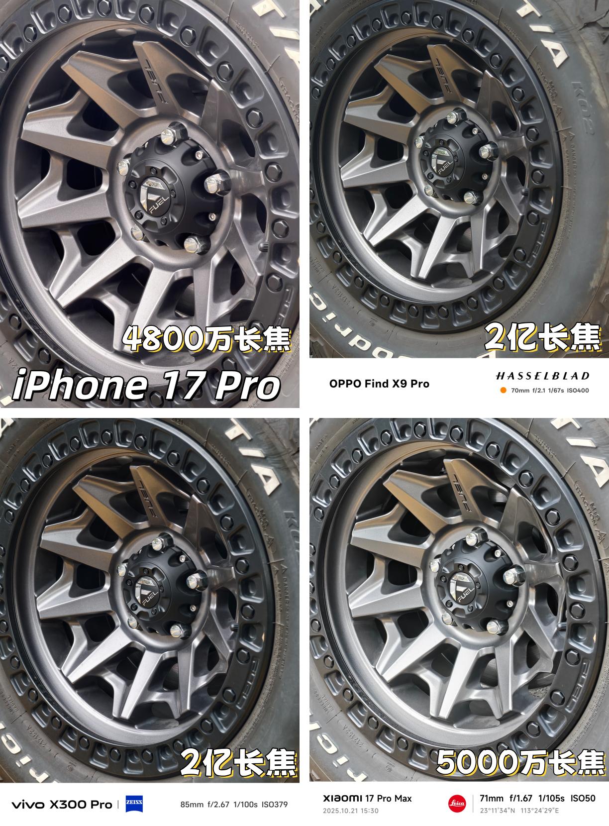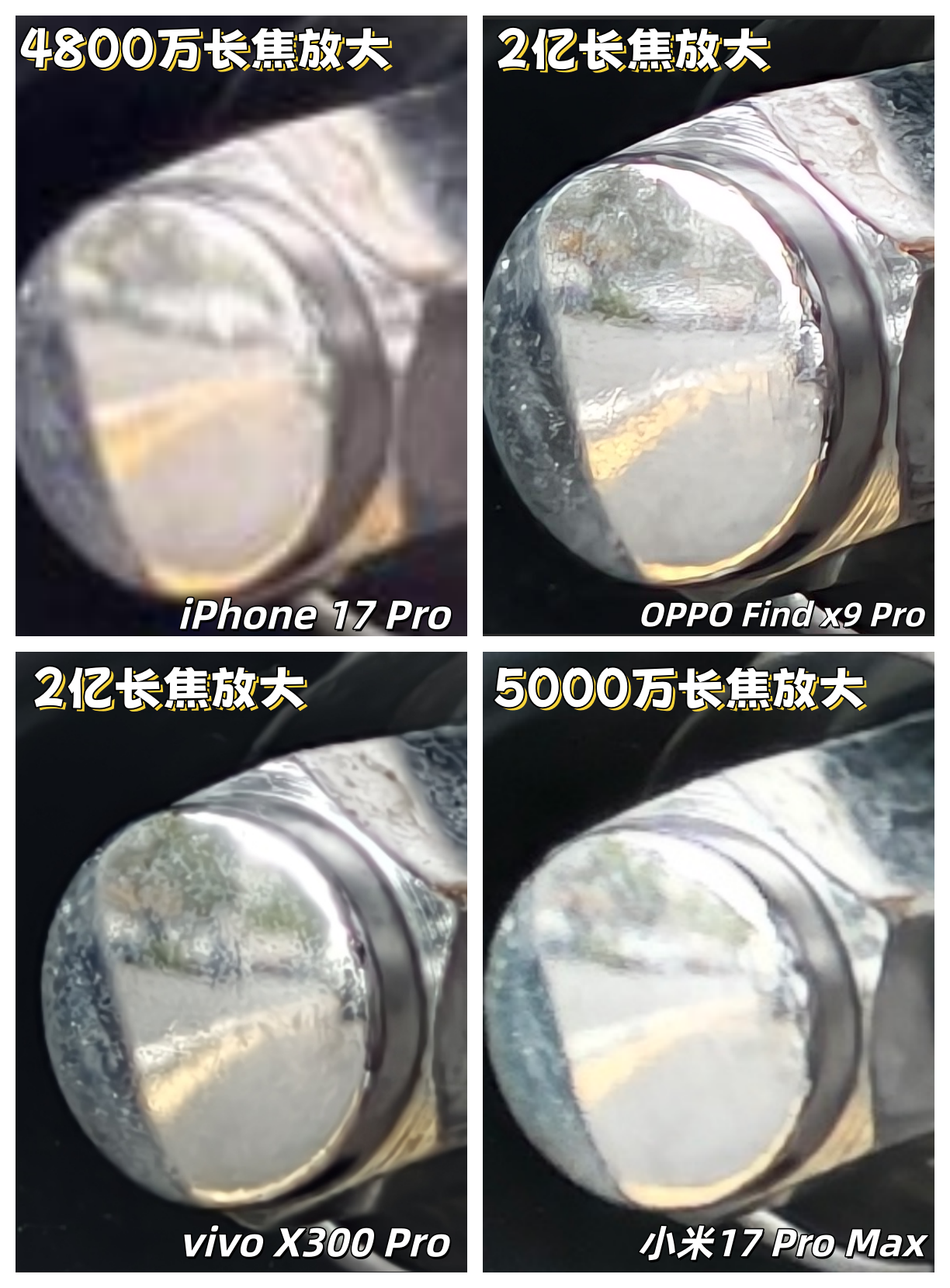 看实际的长焦拍照对比图,OV两家也确实比其他两款手机拍出来的画面质感肉眼可见地好,色彩、锐度都很在线。而在聚焦长焦放大看的情况下,iPhone4800万像素放大后直接糊了,金属表面的细节都发虚,边缘还带点模糊的光晕;小米17的5000万也没好到哪去,金属纹理拍得灰蒙蒙的;而OPPO连反光里的环境都清清楚楚,边缘也不发虚;vivo X300 Pro也还行,细节能看清但比OPPO稍弱一点。