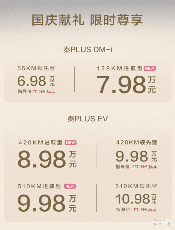 其中,第二代秦PLUS DM-i 55公里领先版限时优惠1万元,起售价降至6.98万元,为比亚迪首款低于7万元的插电混动车型。