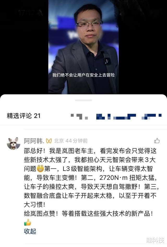 可岚图老车主们却开启 “吐槽” 模式,有车主直言:“L3 级智能架构让车辆变得太智能,或许会导致车主变懒”。其实大家都明白,谁不想拥有更智能、更安全、更好开的车呢?岚图这次发布的新技术,实实在在地戳中了大家的心,才让车主们用这种特别的方式来 “调侃”。