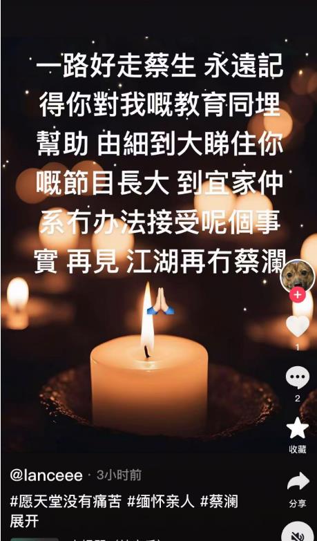 还有网友疑似认识蔡澜,发文哀悼称,一路走好蔡生,永远记得你对我的教育跟帮助,从小到大看着你的节目长大,到现在也没办法接受这个事实,再见,江湖再没蔡澜。