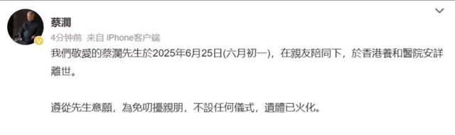 不过,令人惋惜的是,蔡澜的账号在6月27日下午更新,证实了他的死讯,并表示为遵从先生遗愿,遗体已经火化,不设任何仪式。愿蔡澜一路走好。
