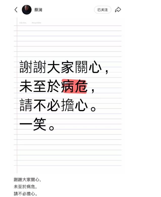 当时蔡澜还发文辟谣,称未至于病危,请大家不必担心。