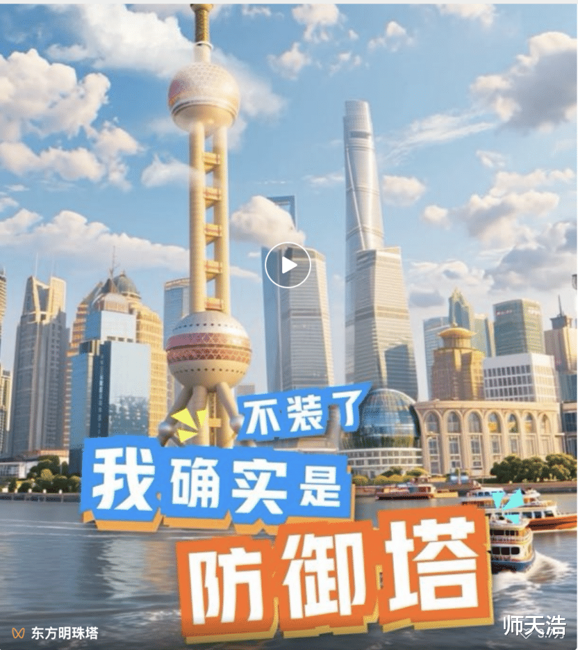 「防御塔」一词来自MOBA游戏,职责是守护己方阵营。网友把东方明珠比作防御塔,把蜜雪冰城比作入侵者,一套「城市版塔防游戏」于是瞬间成立。