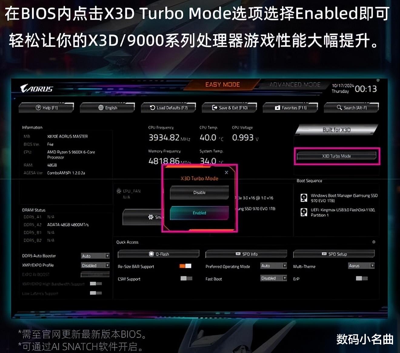 很值得一提的还有技嘉B850M电竞雕的D5黑科技2.0技术,这是一项专为 DDR5 内存优化而设计的高性能加速技术,它通过智能调校内存访问机制,实现带宽提升与延迟降低的双重优化。与传统的手动超频不同,用户只需在 BIOS 中一键开启高频宽模式,系统即可自动识别并激活最佳性能配置,无需繁琐设置即可释放内存潜能。