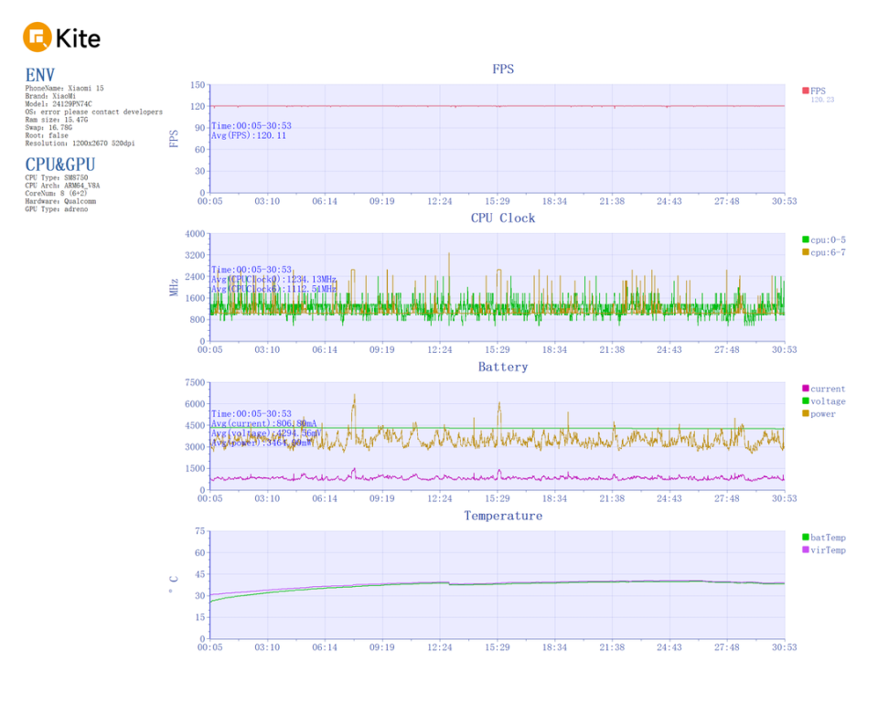《绝区零》分为跑图和战斗两个场景,光映广场10分钟跑图,平均帧率58.42帧,整机功耗4.09W,机身背部最高温度38.2℃。Xiaomi 15这样的帧率表现其实稍微有些差的,但好消息是功耗控制相当不错,希望后续版本能够进一步优化体验。