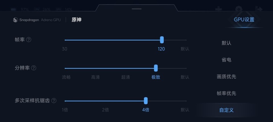 这代Xiaomi 15同样支持超帧超分技术,入口还是游戏加速里面,说实话,这个超分体验确实不太好,每次更改画质都需要重启游戏。还是以《原神》为例,GPU设置中的画质优先档位为900P/60帧,自定义设置将分辨率设置为极致时为1200P/45帧。
