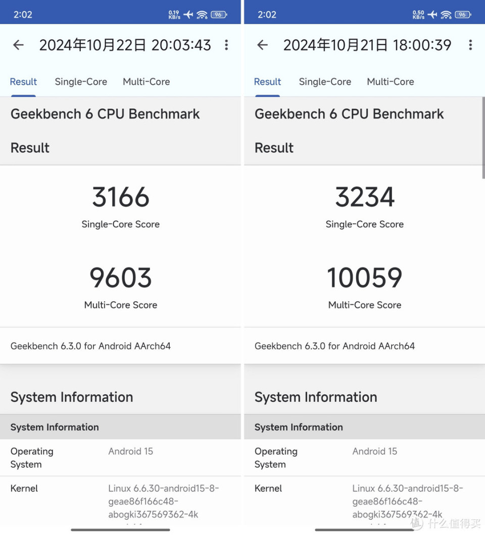 Geekbench 6.3.0版本,Xiaomi 15 单核跑分3166,多核跑分9603。相较于上代平台单核得分提升约42.7%,多核得分提升约31.5%。