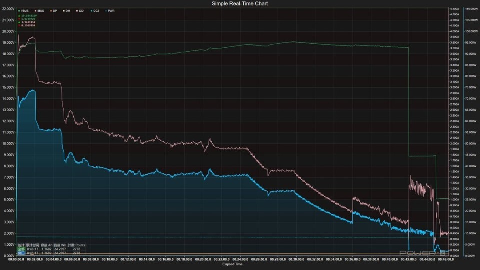 实测从1%开始充电,40分钟前台充满,56分钟完全充满,实测峰值功率约为74W左右,同时我们也测试了第三方充电器,峰值充电功率能够达到25W左右。