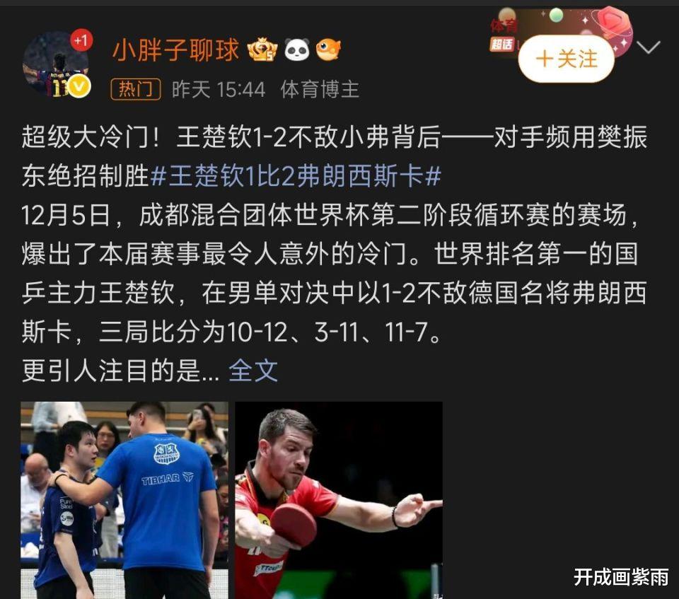 王楚钦以1-2不敌弗朗西斯卡,王楚钦球迷找到了输球的原因,是樊振东去了德甲,手把手教会了弗朗西斯卡打败王楚钦的方法!