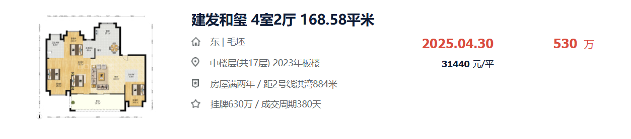 对于和玺,最近一套4月成交是3.14W毛坯,总价530W。