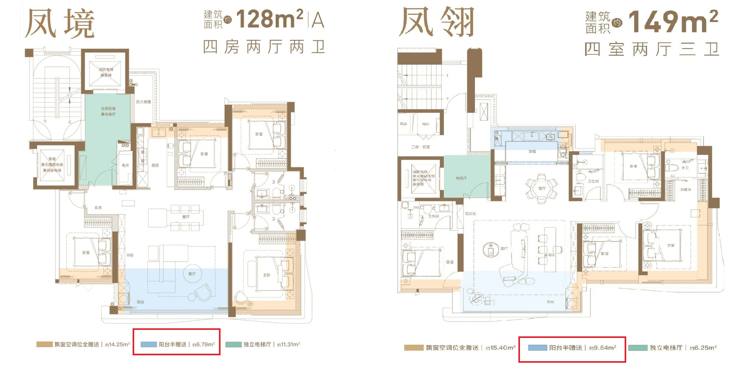 从户型的赠送来看,新规阳台占比提高到20%,实际128平的阳台赠送6.79,计算完占比是15%,然而148平赠送9.64平,占比是20%。