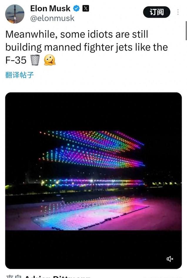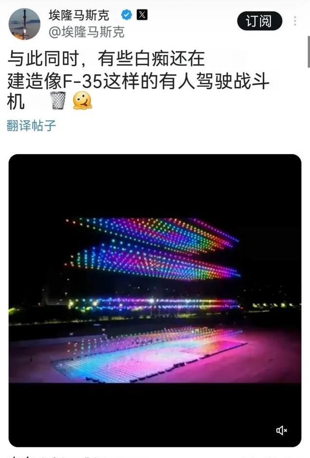 11月24日,马斯克在社交媒体上发布了一段话“一些白痴还在制造F35那样的有人战斗机”,文字下面的视频正是中国进行无人机表演的剪辑视频。