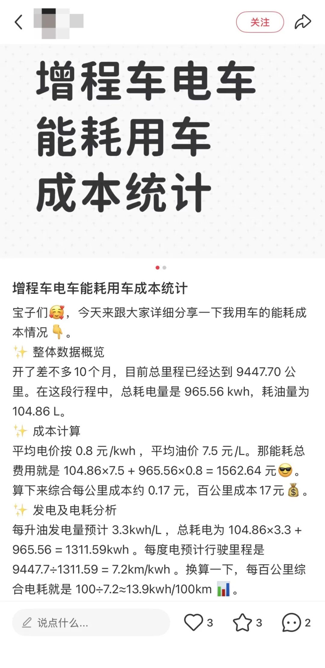 何先生算过一笔账:他的增程车每公里成本约7毛,而朋友的纯电才1-2毛。他一年跑2万公里,光油电开支就比纯电多花1万多,三年下来差出3万多。