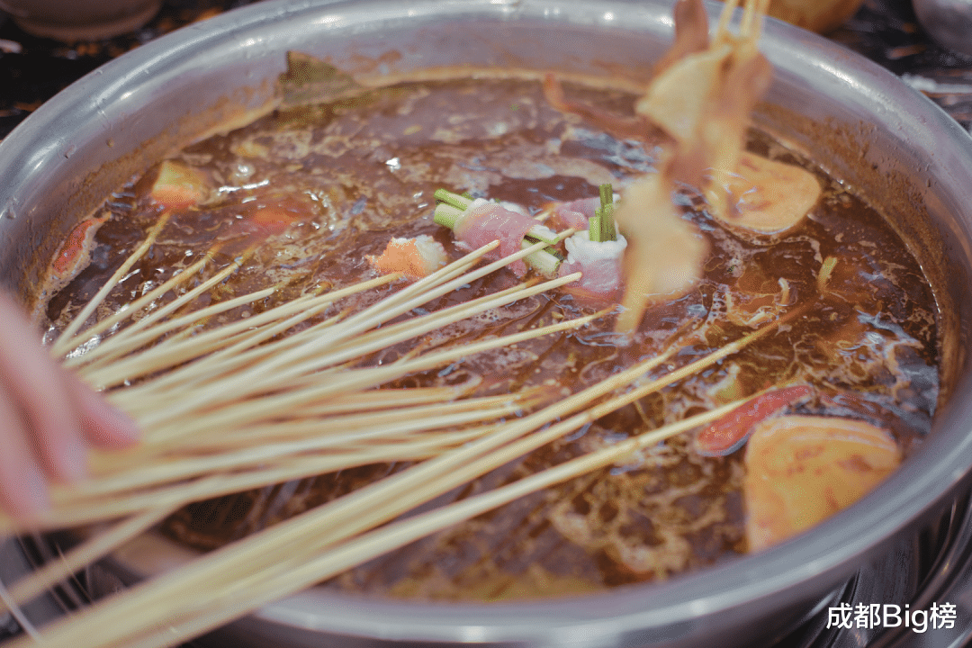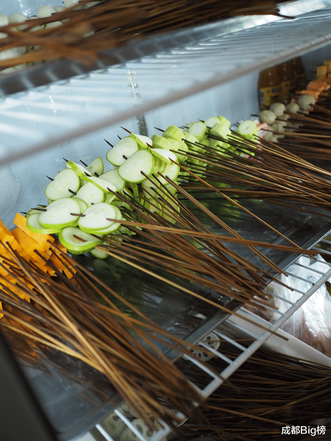 成都人拿菜就要按“把”来衡量,《人生一串》在成都都要变成《人生一把》。一把大概5-10串,没有具体的数,随心情起伏,拿得多也吃得完,拿得少就再加。只有碰到不喜欢的菜才会按一人一串来拿。