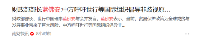 参考资料财政部部长蓝佛安、央行行长潘功胜,在美重磅发声! 政知新媒体财政部部长蓝佛安:中方呼吁世行等国际组织倡导非歧视原则、自由... 南财快讯