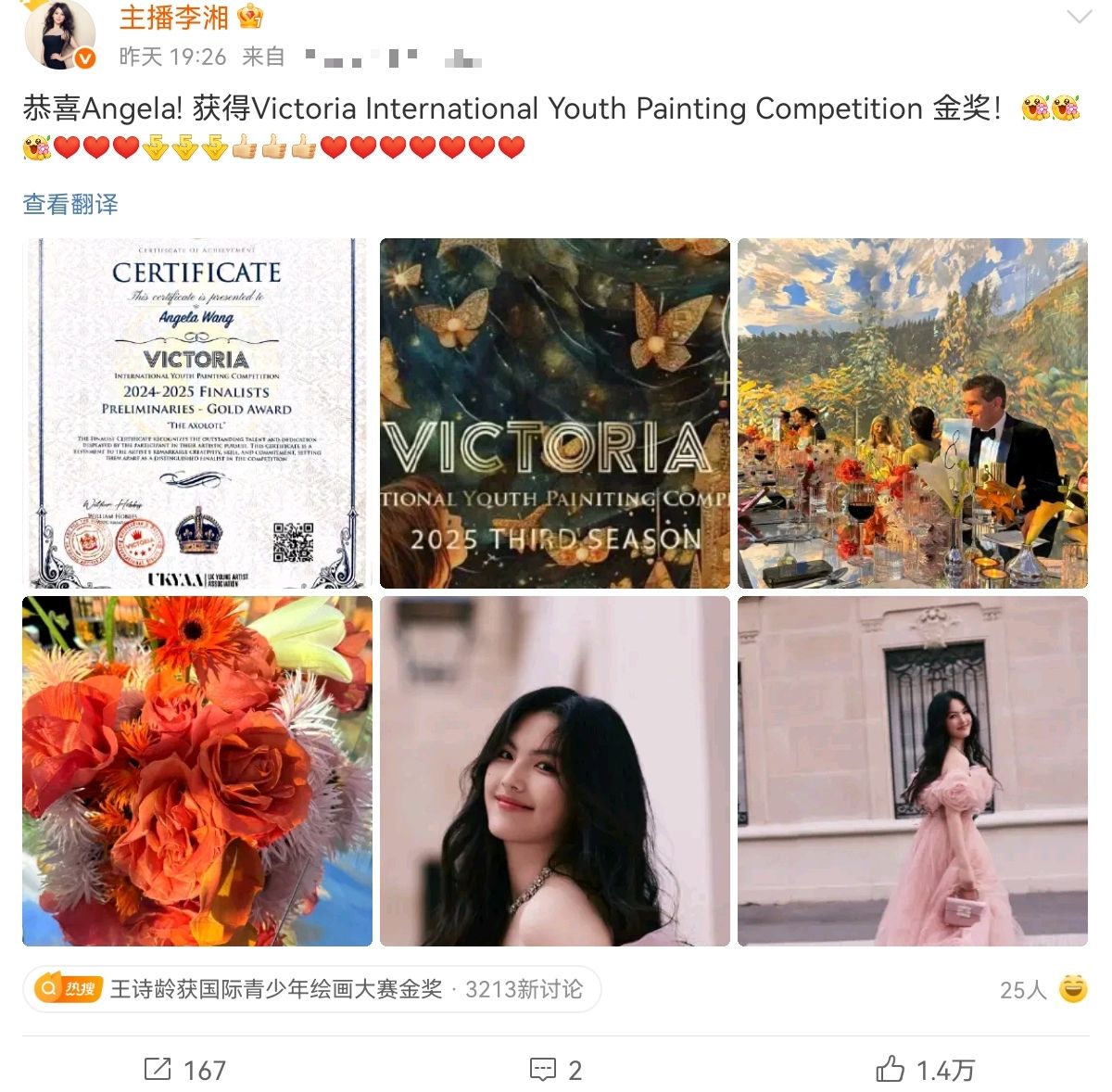 10月9日,李湘和王岳伦在社交平台上先后发布动态,文案一模一样,均是恭喜王诗龄获得了维多利亚国际青少年绘画大赛的金奖。